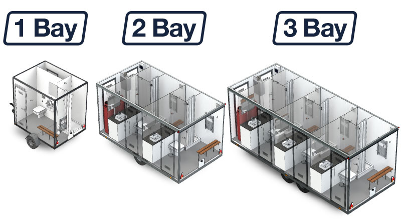 Available in 1-bay, 2-bay and 3-bay layouts, each bay includes a flush toilet, shower and sink, making the range ideal for sites that require higher standards of hygiene and user comfort in an all-in-One Bathroom Layout.