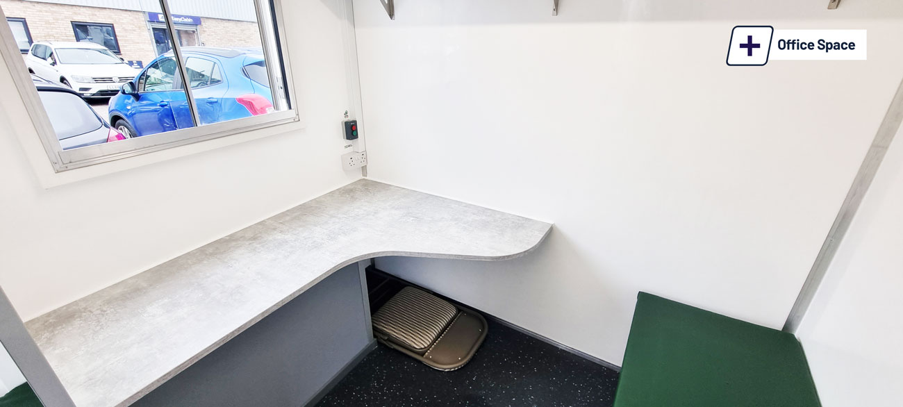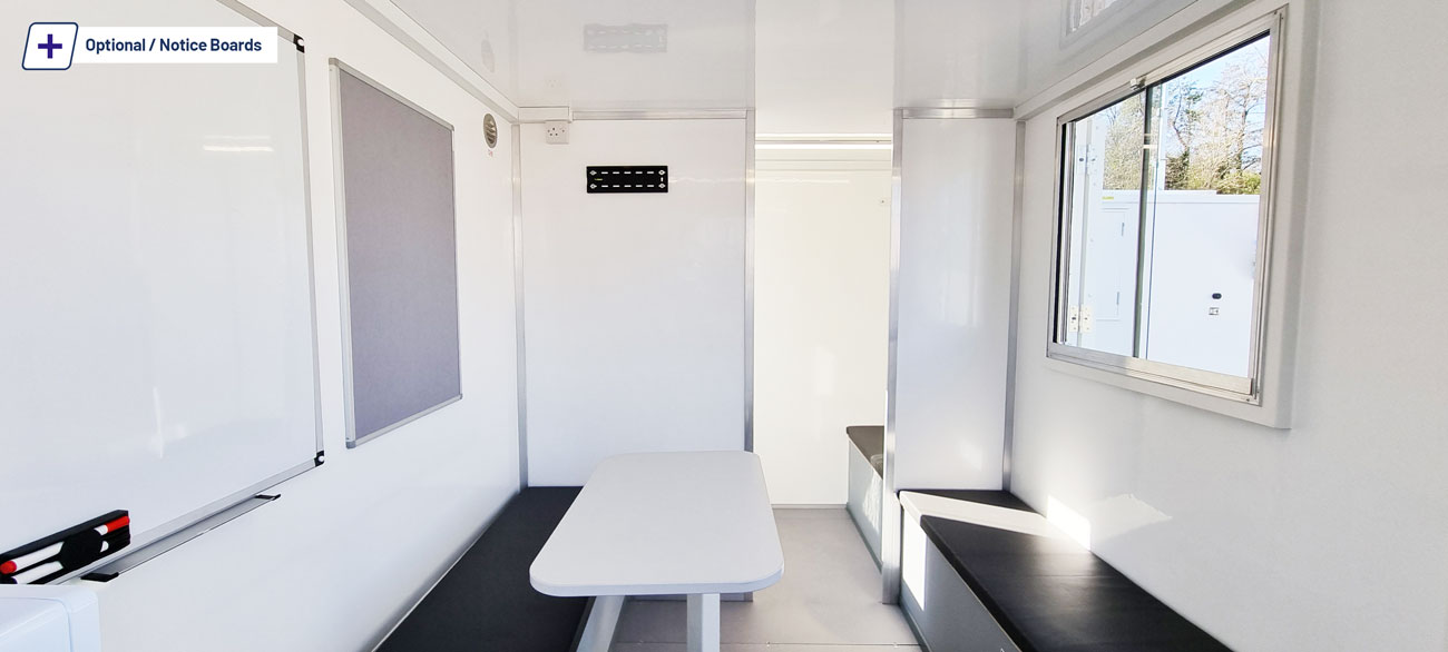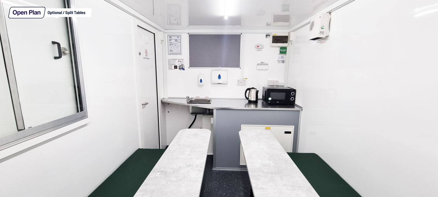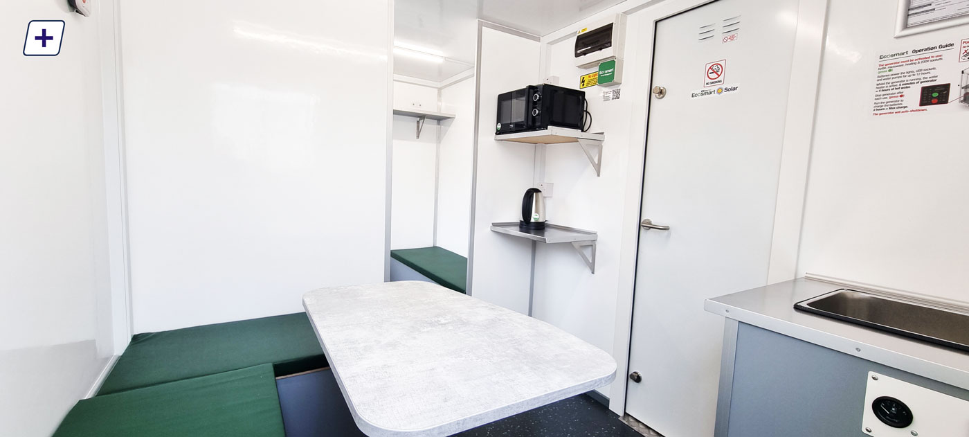 Inside, you’ll find a bright, open-plan canteen area with bench seating, a separate toilet and drying room, heating, hot water on-demand, sink, kettle, microwave, power sockets and USB charge points. Other layout options include an office or exta-large seating areas.