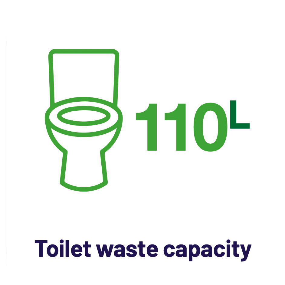 The standard configuration includes a recirculating chemical toilet, hotwash sink with electric water heating, towel and soap dispensers, and internal LED lighting.