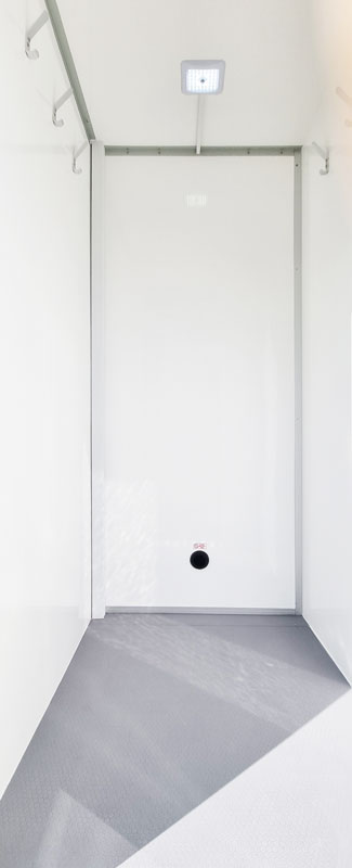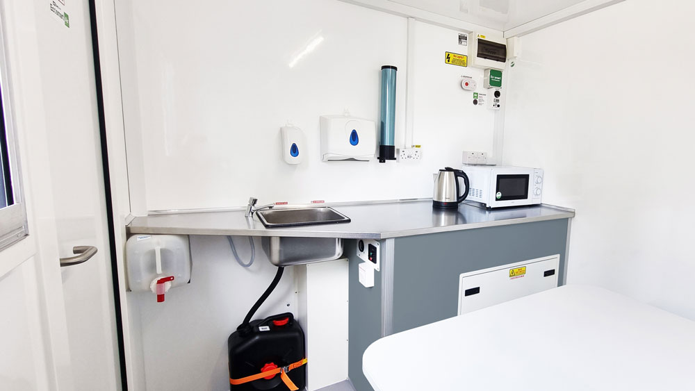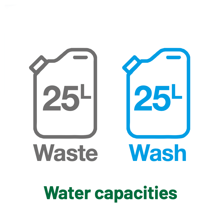 The standard configuration includes a recirculating chemical toilet, hotwash sink with electric water heating, towel and soap dispensers, and internal LED lighting.
