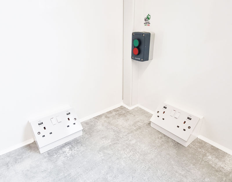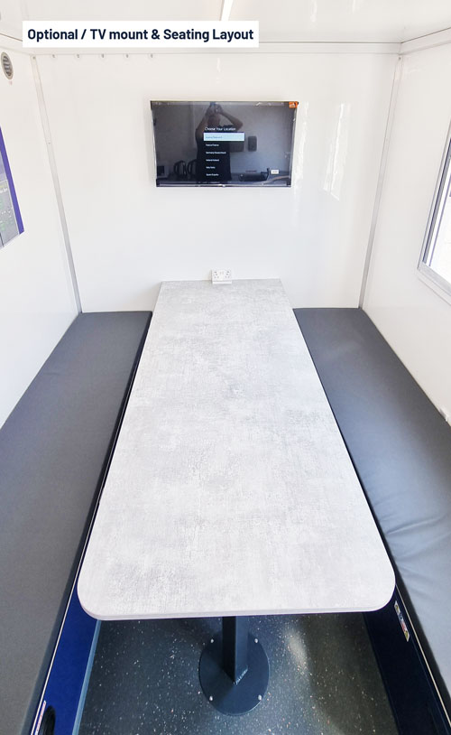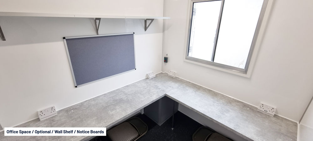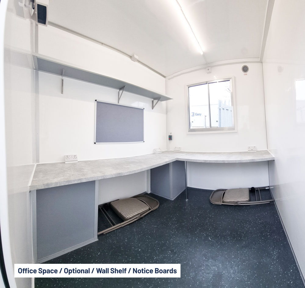 Inside, you’ll find a bright, open-plan canteen area with bench seating, a separate toilet and drying room, heating, hot water on demand, sink, kettle, microwave, power sockets, and USB charging points. The open-plan layout also includes a separate office area, providing a practical workspace on site.