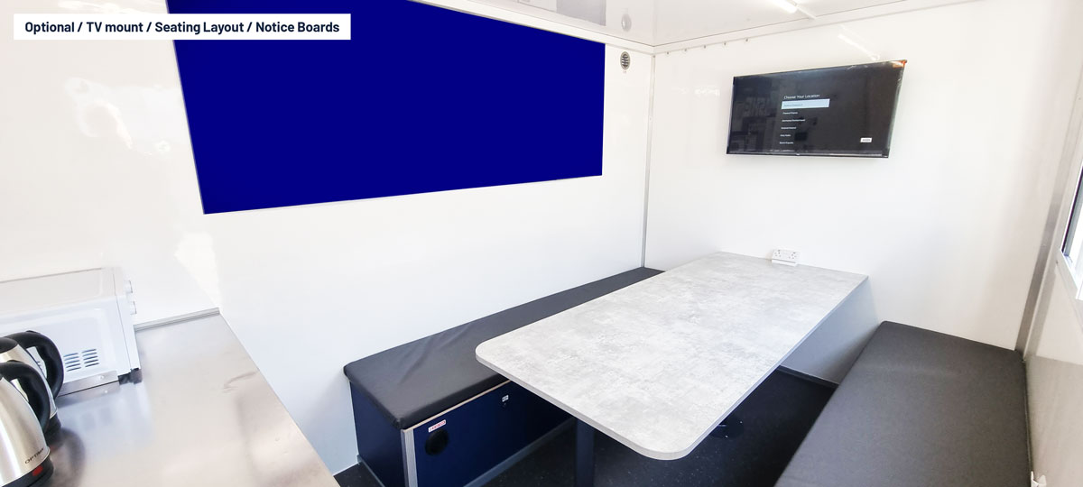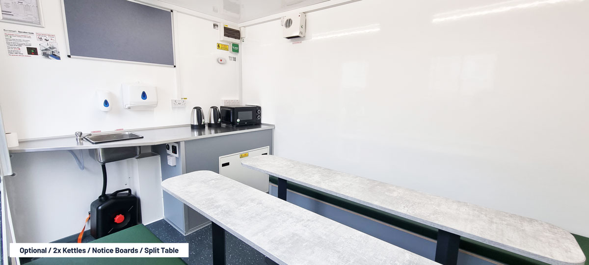 High spec fitted canteen area. Extra bench seating. Separate office. Separate drying room & dual toilets.