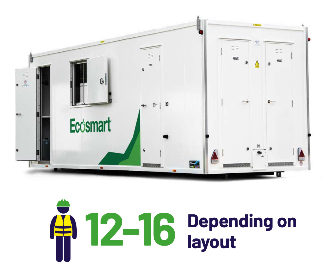 The Ecosmart 22.9 is the same size as a static welfare unit on a towable trailer. It combines comfort, efficiency, and smart design in a 22.9ft footprint. Built for 12–16 site workers, it provides everything your team needs to rest, eat, and recharge — all in a secure, easy-to-tow welfare unit.