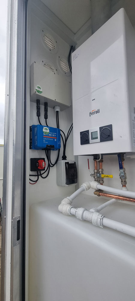 Our Solar Toilet Xtra Range is designed to be used without mains power or water. Only LPG and solar power is needed to run the unit. Optional mains waste output is available for the Flush toilet upgrade. A 16A mains power input is available for quick charging.