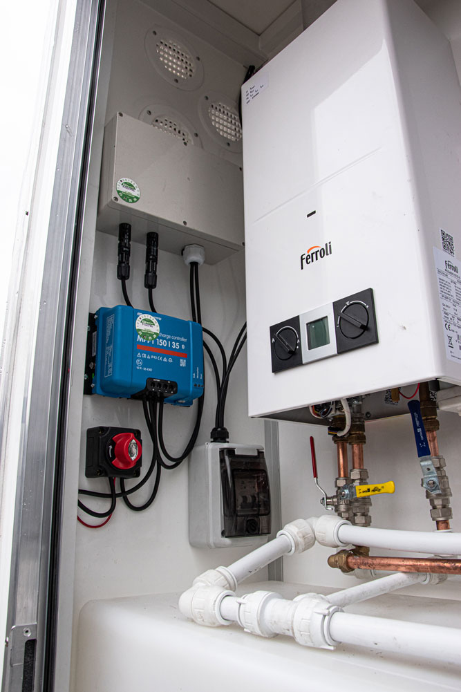 This intelligent hybrid setup reduces fuel consumption, lowers CO2 emissions and ensures reliable hot water and lighting throughout the working day.