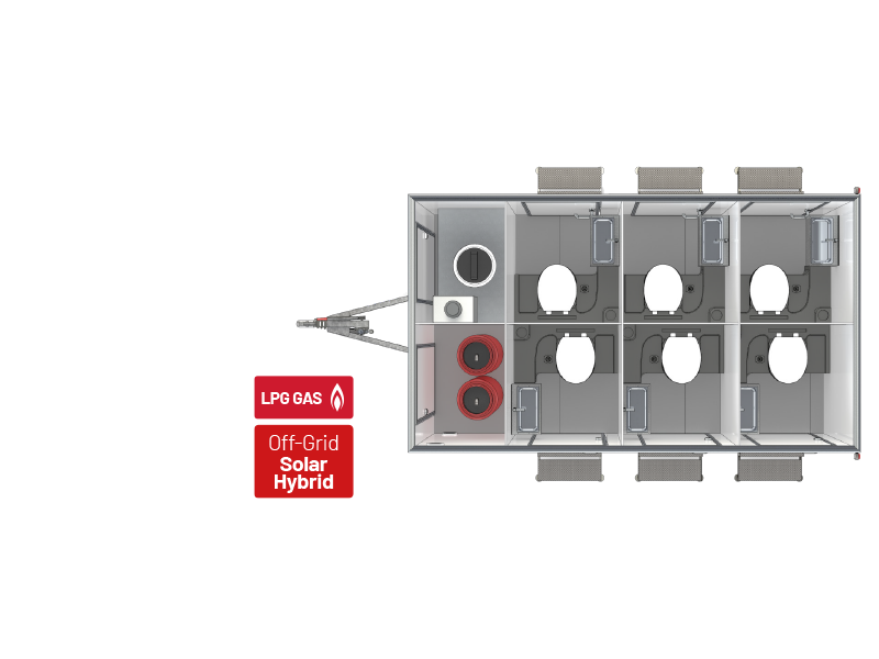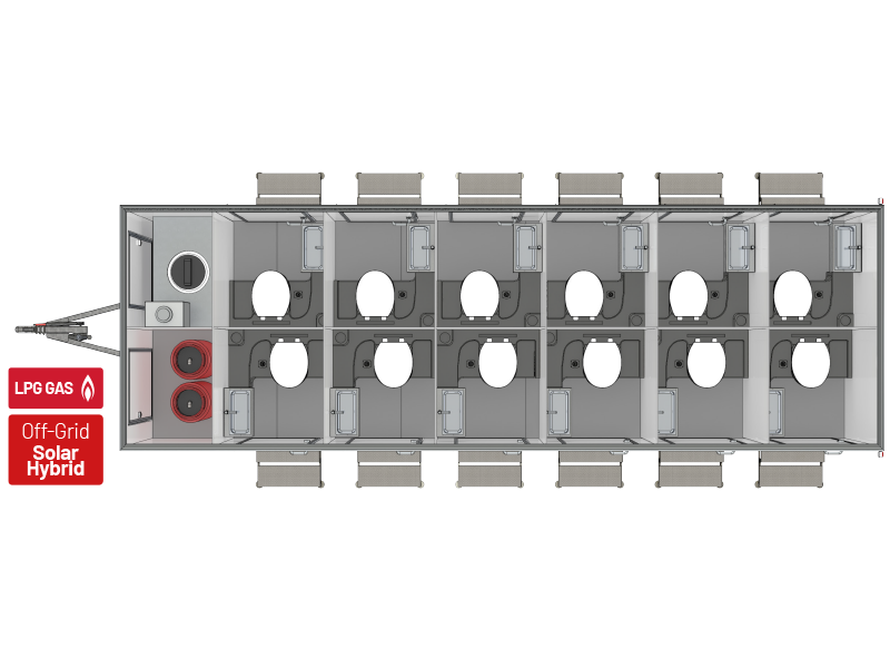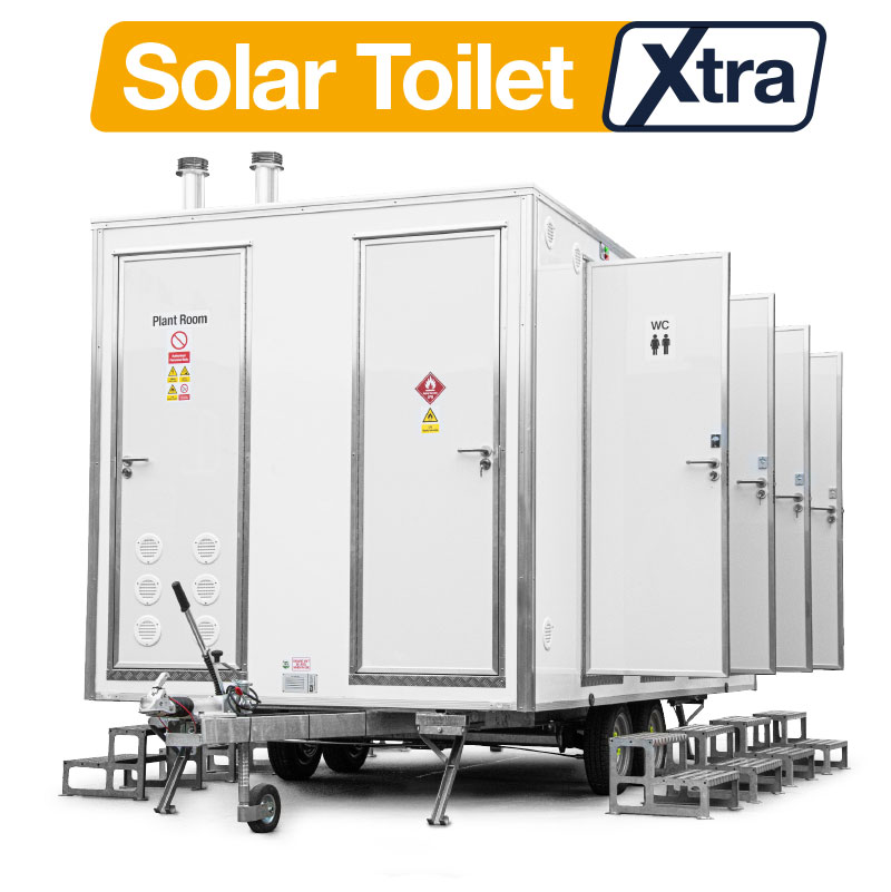 The Solar Toilet Xtra is a hybrid, off-grid multi-cubicle toilet unit designed specifically for remote construction sites, infrastructure projects and large outdoor events. Combining solar power, battery storage and LPG gas heating, this advanced mobile toilet solution delivers reliable, self-sufficient welfare facilities where mains services are limited or unavailable.