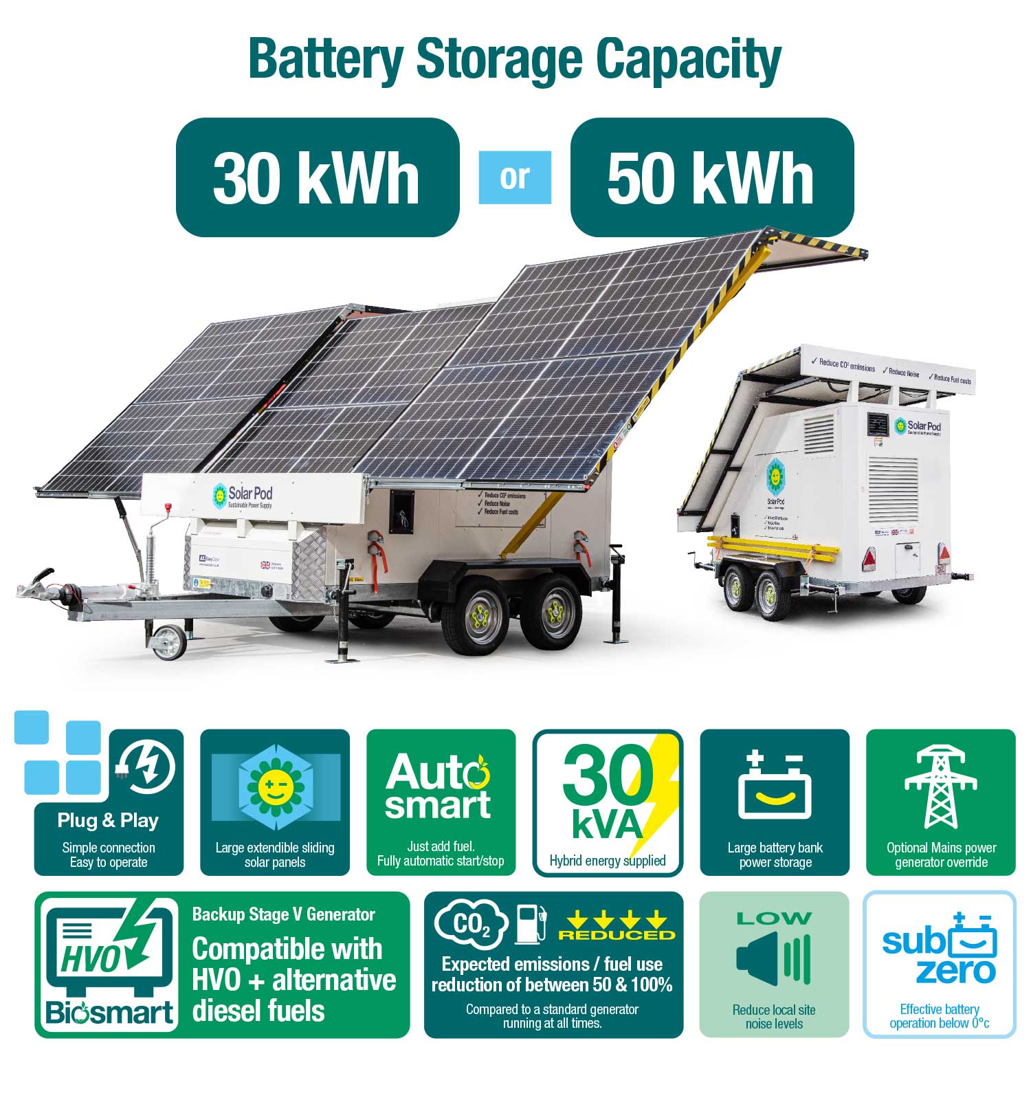 The Solar Pod (patent pending)portable solar generator significantly reduces carbon emissions and fuel costs associated with power provision by harvesting solar energy to provide free power to your sites. With reduced fuel and energy costs, our solar power generator systems are a smart choice for any site or event. Portable solar power stations like our Solar Pods have the added benefit of making construction sites more environmentally friendly. By using renewable fuel sources, these generators reduce the amount of emissions and fuel consumption on your site. So if you are looking to save money, lower emissions and reduce noise, then our Solar Pod has all of the answers.