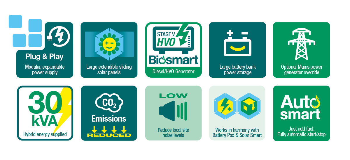 Our hybrid solar power generator systems come complete with a backup generator. The built-in Ecosmart systems efficiently manage the power supply between solar PV, battery bank and HVO generator. They provide peace of mindknowing that you will never have to worry about running out of power on site.