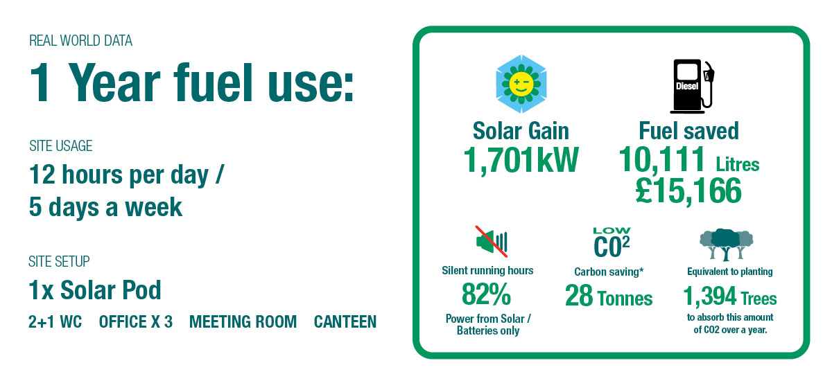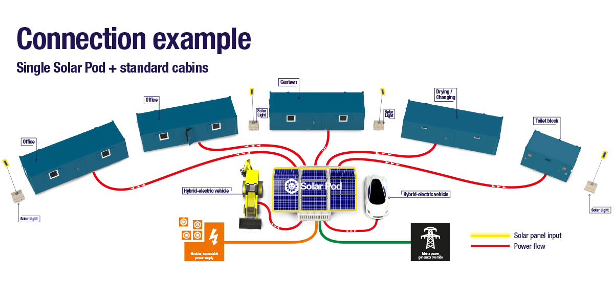 An optional mains power input is also available with our hybrid power generators. This will by-pass the generator and ensure only solar/batteries/mains are used. 100% zero noise operation. Maximise solar input to your existing site accommodation by swapping the site generator with a Solar Pod. Further energy savings can be made with Solar Lights.