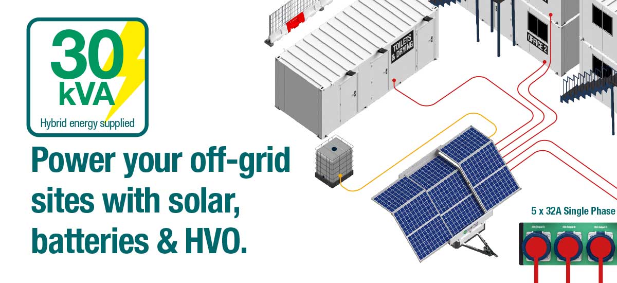 Hybrid solar power generator. Large solar panels & batteries with a backup diesel generator on standby. Proven to reduce local emissions and fuel costs all year round, in all weather. In use UK wide.