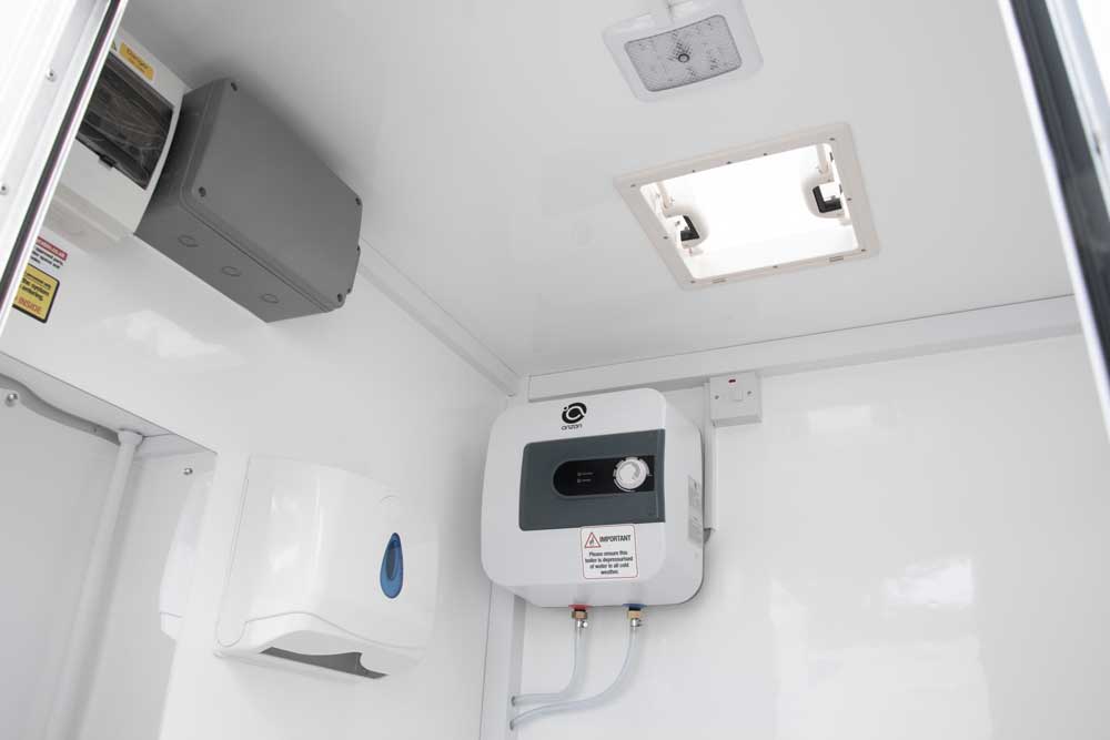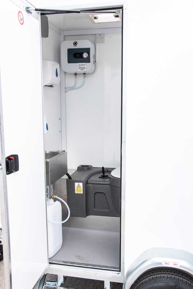 Mobile Hybrid Toilet trailer, with roof mounted solar panels to ensure power to LED lighting & pumps. LPG gas boiler for water heating. Integral water & waste tanks.